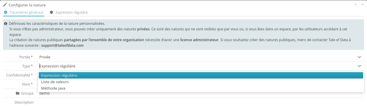 Il est possible dans Tale of Data d’augmenter les capacités de la plateforme pour qu’elle détecte et vérifie la qualité de vos propres objets métiers, en plus des natures supportées en standard (comme les numéros de téléphone, les IBAN, les prénoms, etc). Ces natures personnalisées seront utilisées partout dans la plateforme, autant dans la partie Mass Data Discovery, que dans la partie Flows, tout particulièrement dans l’éditeur de préparation et avec le noeud de validation.